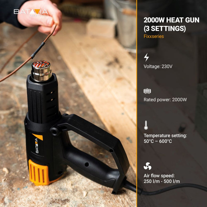 Whether you’re stripping paint from window frames or applying shrink wrap, the Batavia 2000W Heat Gun provides the power and precision you need. Thanks to the five included nozzles (including a reducer, spreader, and spoon nozzle), you can tackle any project like a pro.
